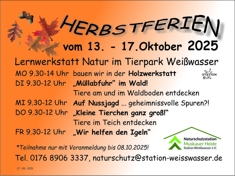 Die Teilnahme ist begrenzt und nur mit Voranmeldung bis 08.10.2025 unter naturschutz@station-weisswasser.de oder 0176 8906 3337 (Hinterlassen einer Nachricht auch gern auf der Mailbox) möglich!